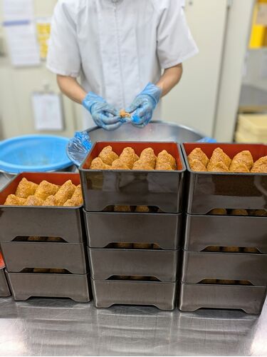 今日はたつの市の施設さまでイベントです😊 焼きそば、いなり寿司、焼き鳥、かき氷などなど!! いなり寿司は次長と二人で160個つくりましたよ✨ たくさん並ぶとかわいい😊 11時から提供開始です!! 楽しみだ~🌸